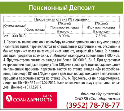 Вклад месяца «Пенсионный Депозит» от Филиала «Иркутский» ОАО КБ «Солидарность»