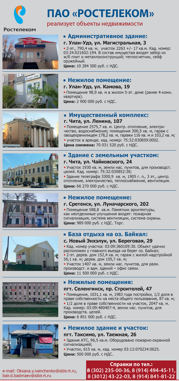 ПАО «РОСТЕЛЕКОМ» реализует объекты недвижимости в Республике Бурятия и Читинской области