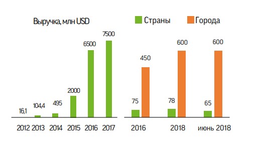 Международная онлайн платформа по заказу такси и прочих транспортных услуг всего за десять лет существования по-настоящему перевернула современное представление о сервисах, запустив целую волну повсеместной «уберизации». Сегодня услуги Uber доступны в 600 городах 77 стран, в компании работает более 16 тысяч человек и порядка 3 млн водителей, в 2017 году выручка составила 7,5 млрд долларов, а темпы роста + 15%.