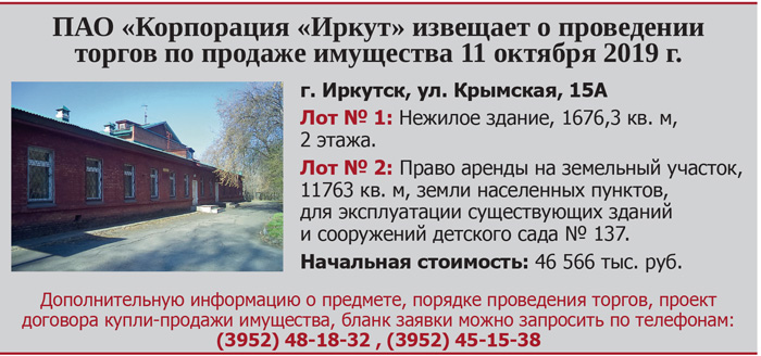 ПАО «Корпорация «Иркут» извещает о проведении торгов по продаже имущества 11 октября 2019 г.