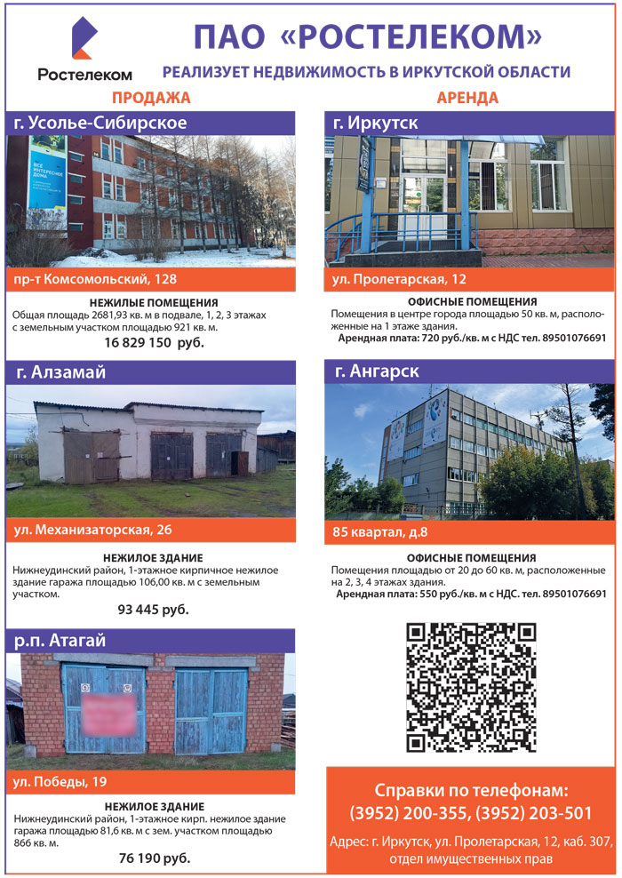 ПАО «РОСТЕЛЕКОМ» РЕАЛИЗУЕТ НЕДВИЖИМОСТЬ в Иркутской области