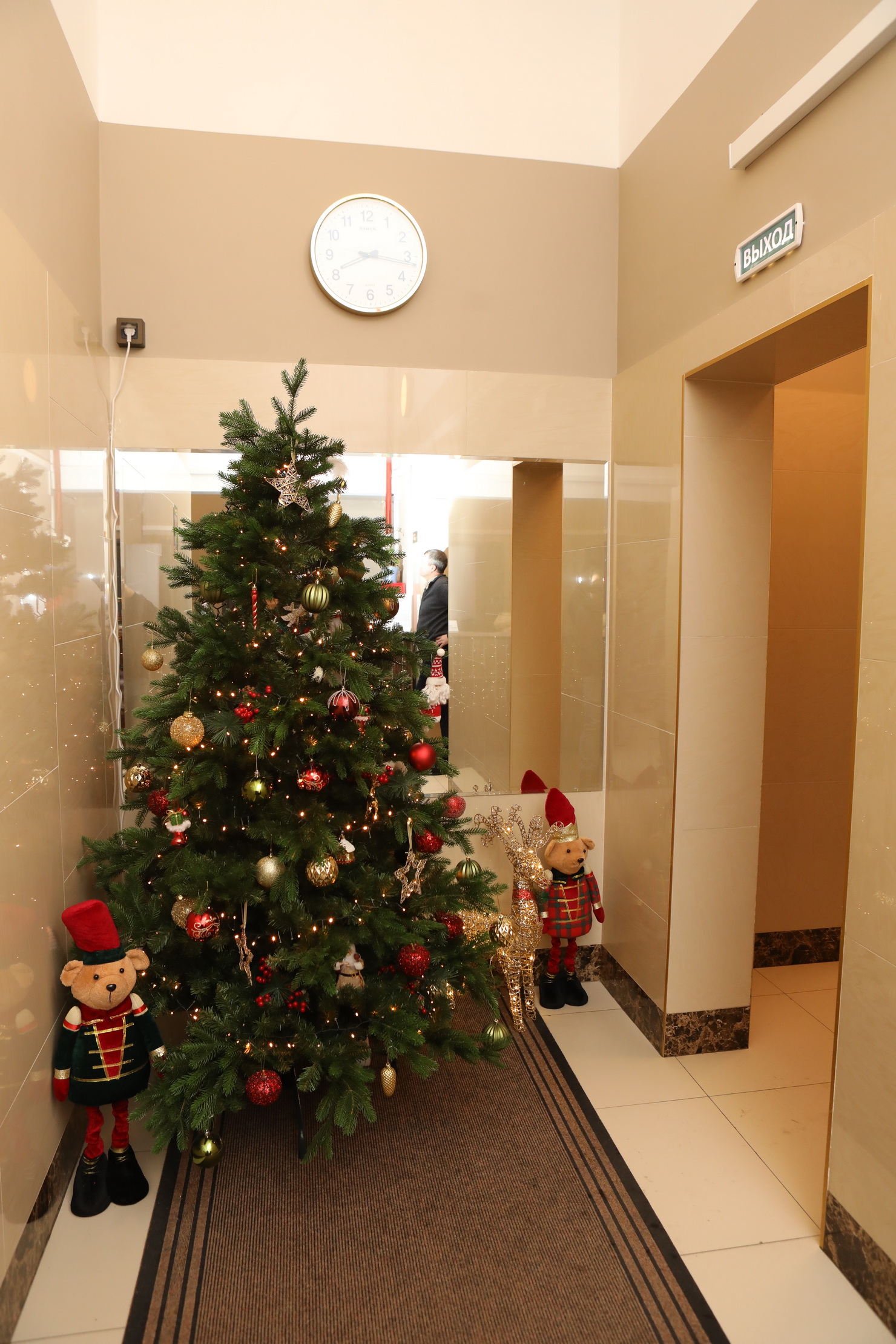 На этаже, где находится квартира Георгия, – мягкое двухуровневое освещение, играет приятная музыка, голову кружат ароматы дорогого отеля. Зона лифта и портал к нему отделаны дорогим керамогранитом. В просторном холле стоит новогодняя елка, белый диван, на полках – книги. Есть место для переговоров с мягким уголком и столиком.