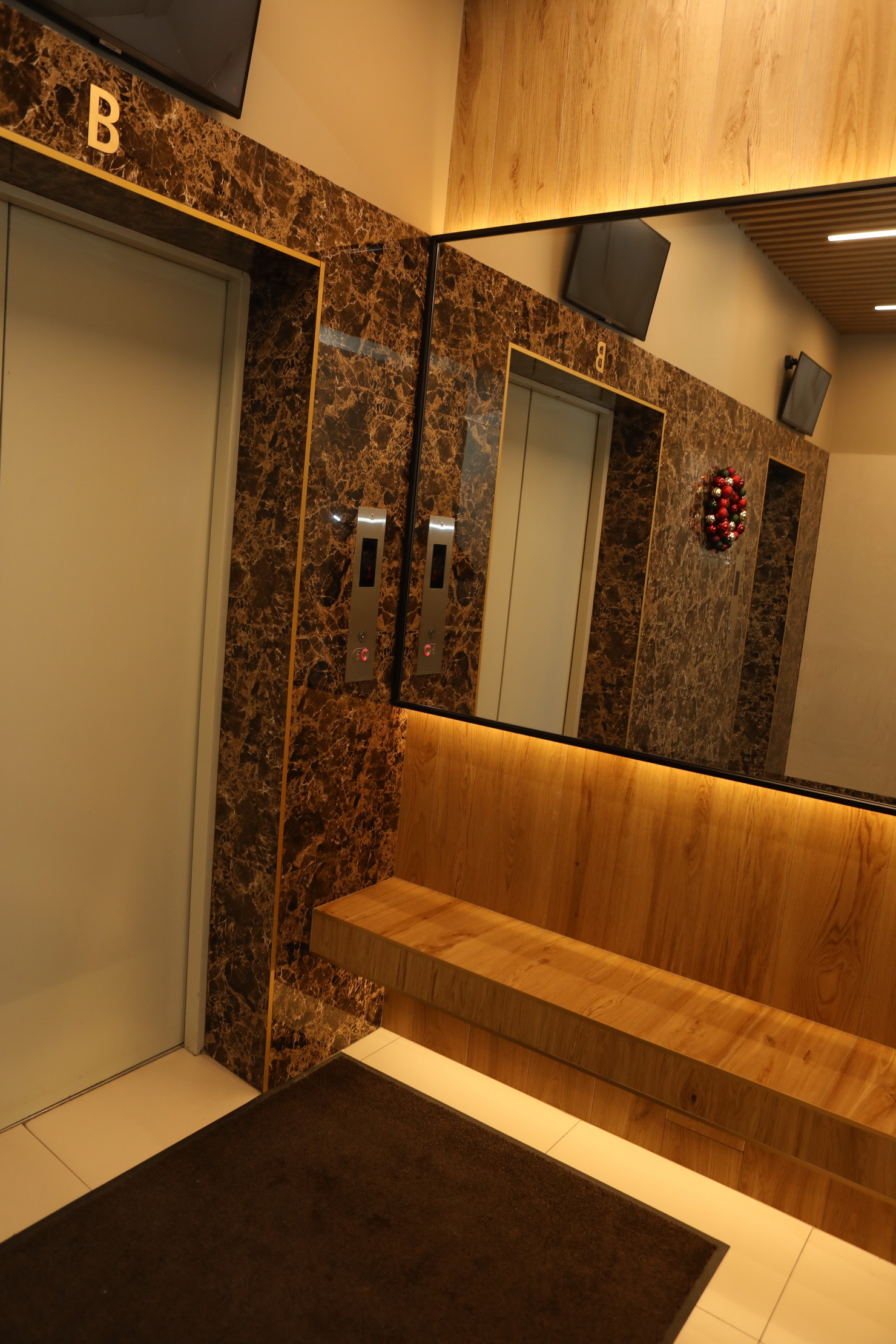 Позаботились и о безопасности: в лифтовом холле установили систему с мониторами, теперь видно, кто едет в лифте.