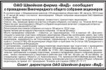 Сообщение о проведении внеочередного общего собрания акционеров ОАО Швейная фирма «ВиД» [08.12.2014]Место нахождения: 664003, Российская Федерация, Иркутская область, г. Иркутск, ул. Фурье, 8. ОГРН 1023801003874. ИНН 3808008510. КПП 380801001.